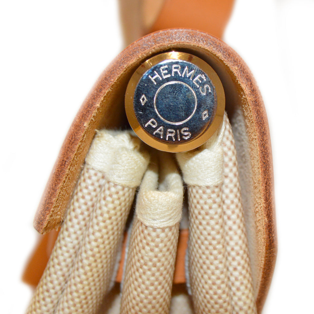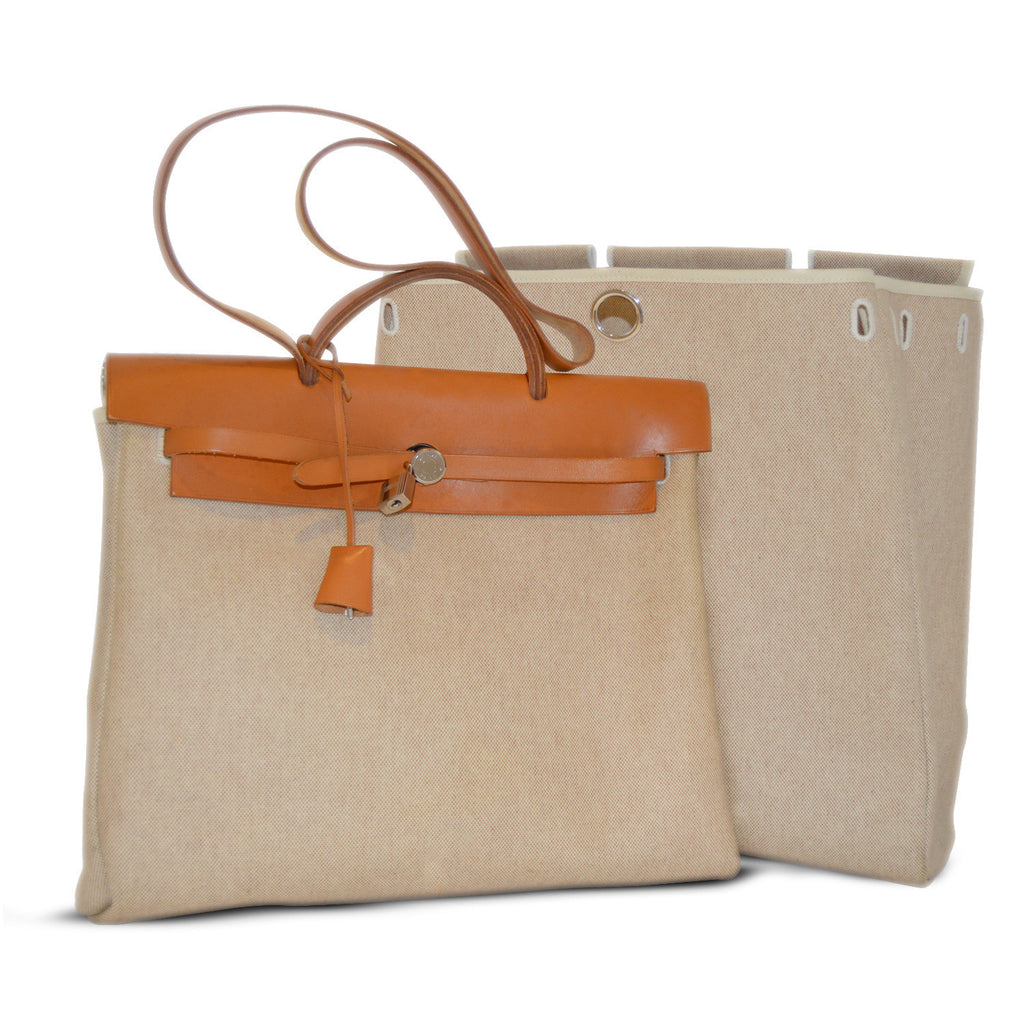 Details: Tan Interchangeable Coated Canvas Hermès Herbag MM with palladium hardware / Tan Leather Trim / Tan Coated Canvas Interior / Pull-Through Closure at Front.